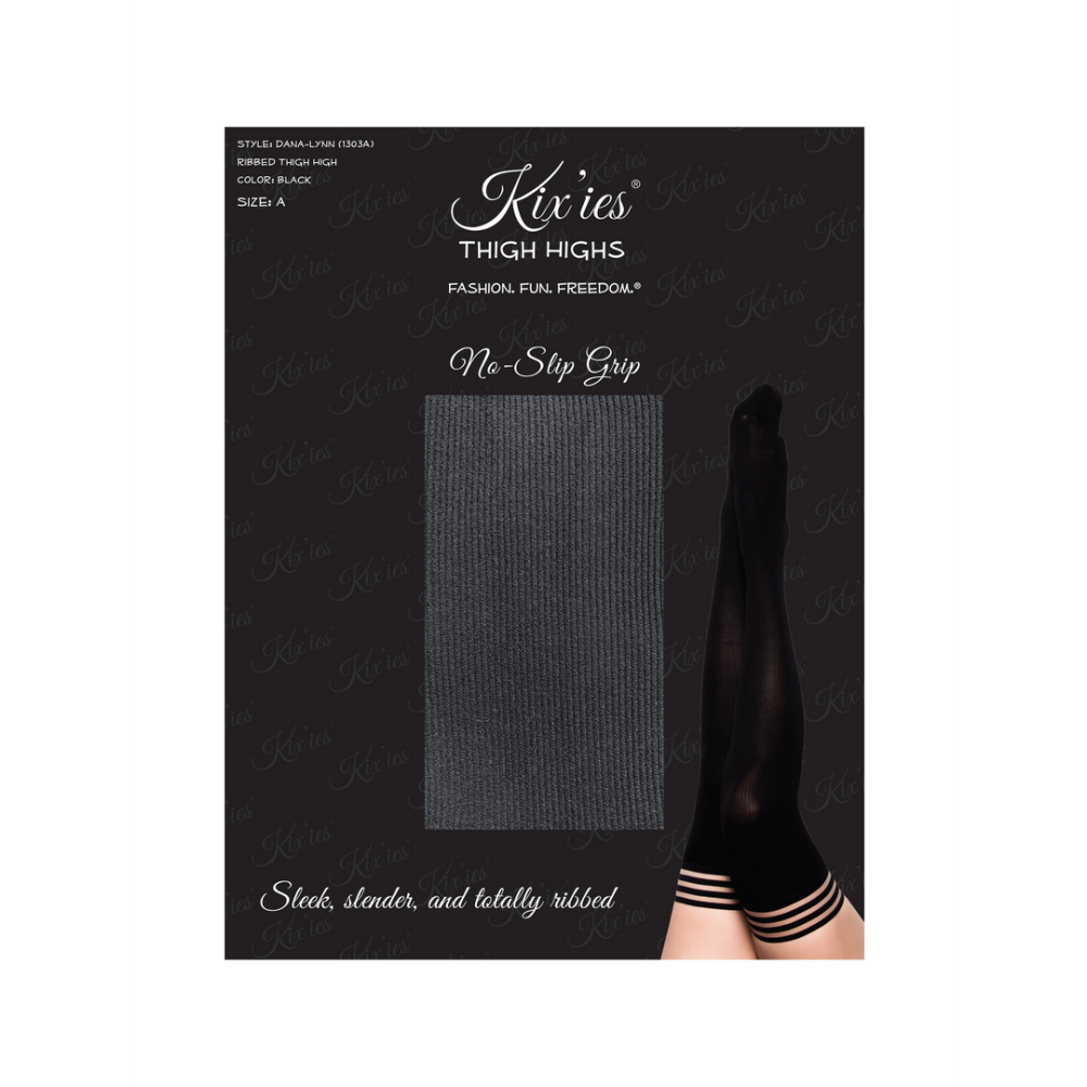Kix’ies black ribbed thigh-high stockings are the perfect everyday thigh-high, especially during the colder seasons! With a classic black, opaque stocking, keep your legs cozy and cute all year round. Kix’ies thigh-highs are designed for all-day wear, with a no-slip-grip. We offer Petite to Plus Size Stockings and are the #1 thigh-highs that actually stay up! Sizing: Measure by height first and thigh circumference second. Weight can be arbitrary when sizing for a thigh-high. We all carry our weight differently be it in the tush, tummy or thighs which have no bearing on finding the perfect Kix’ies® fit! Time to kick those binding tights and outdated hosiery to the curb!
